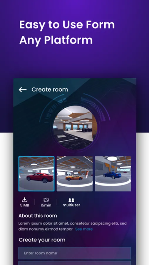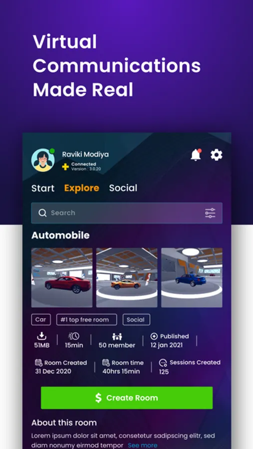 * Explore Section contains all the available environments/assets. User can download and create rooms in the selected environment.