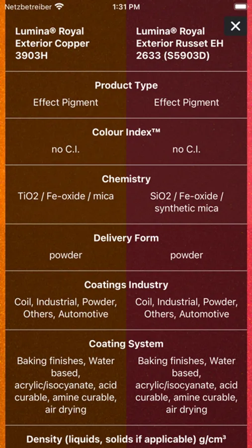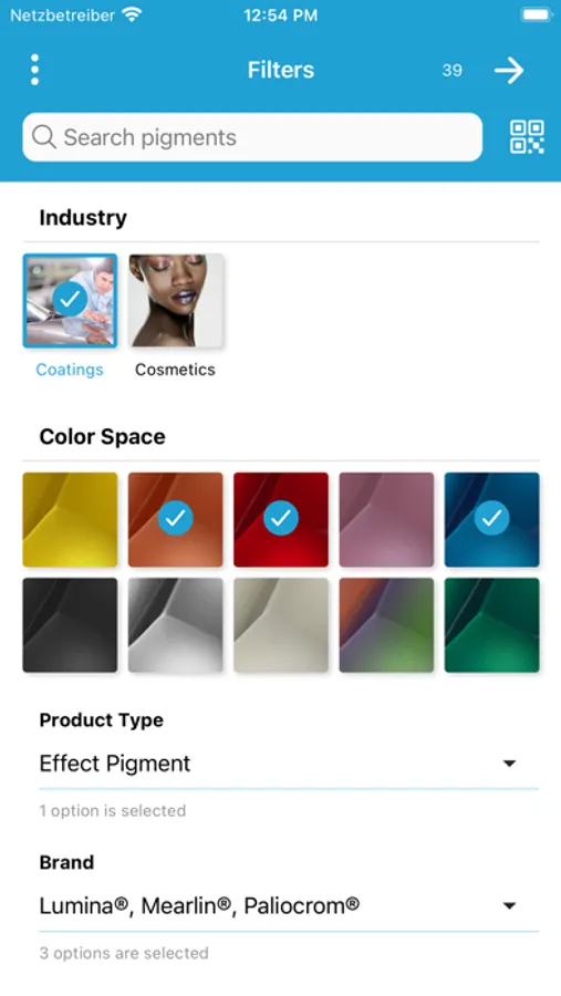 Search the pigments of your choice by use of the multiple filters offering many industry-relevant criteria. Group and save your personal pigment collections. Gain visually the interactive appearance impression and compare your products of interest side by side, as you are used to. Obtain the technical data, and the coloristic behavior plotted in convenient professional diagrams.