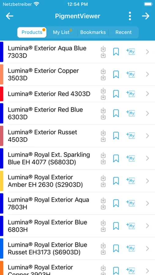 The filtering result is given in the list "Products". Use the lists to select and download pigments, that you want to get displayed in the gyro-controlled "Viewer" window.