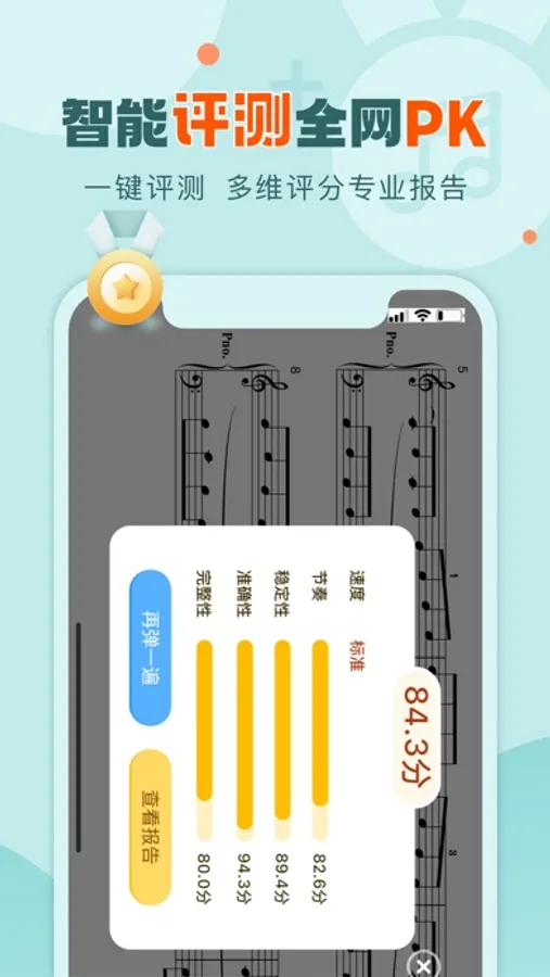 没问题!我们支持全曲评测和分段评测,评测结束会自动给出多维度的打分报告,每次的进步都可以在报告里一目了然,并且能根据各个维度的弱项各个击破,针对性提高。