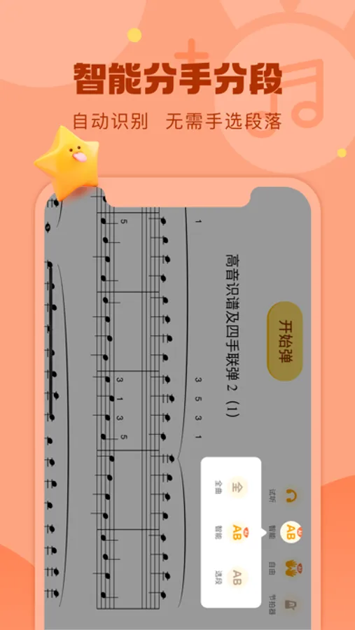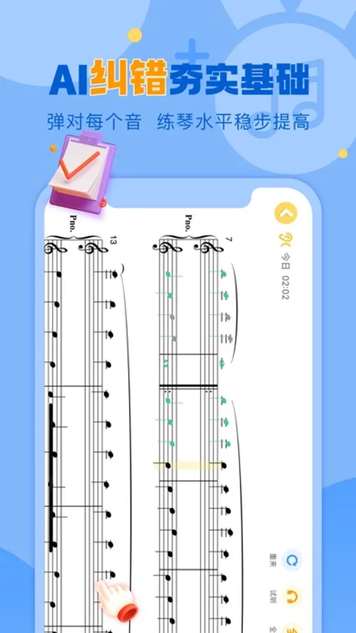 我们来帮你!智能逐个识别音符,不会弹会有提示,让你把基础练扎实,真正学会一首曲子。