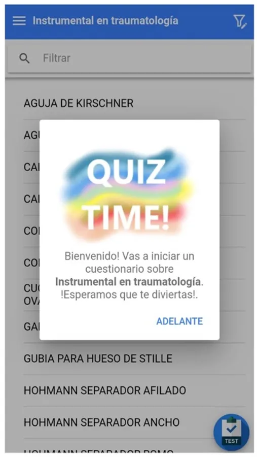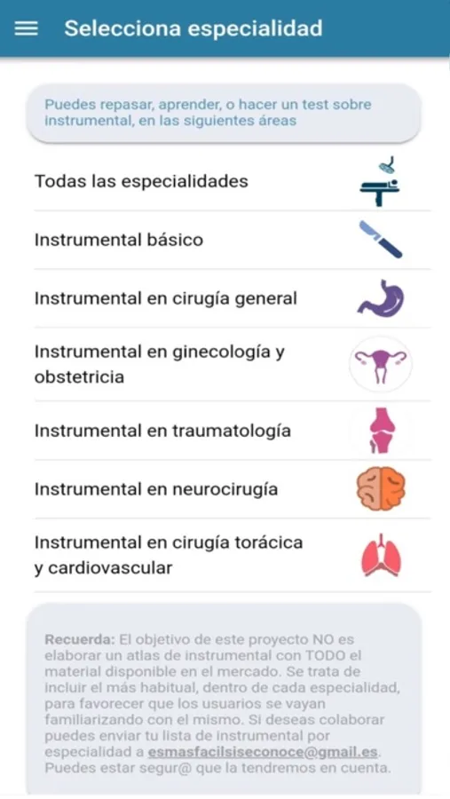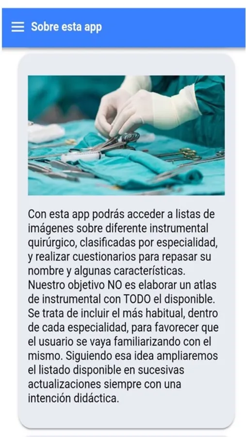 La complejidad del instrumental quirúrgico es conocida por todos los que realizan sus labor profesional en un quirófano. El gran número de elementos manipulados por los instrumentadores quirúrgicos, en una intervención, hace necesario su conocimiento para la correcta identificación, gestión y posterior entrega al cirujano.Con esta app podrás acceder a listas de imágenes de instrumental quirúrgico, clasificadas por items, y realizar cuestionarios para repasar su nombre y algunas características.Nuestro objetivo NO es elaborar un atlas de instrumental con todo el disponible en el mercado. Se trata de incluir el de uso más habitual, dentro de cada especialidad, para favorecer que el profesional se vaya familiarizando con el mismo de una forma amena. Siguiendo esa idea ampliaremos el listado disponible en sucesivas actualizaciones siempre con una intención didáctica.