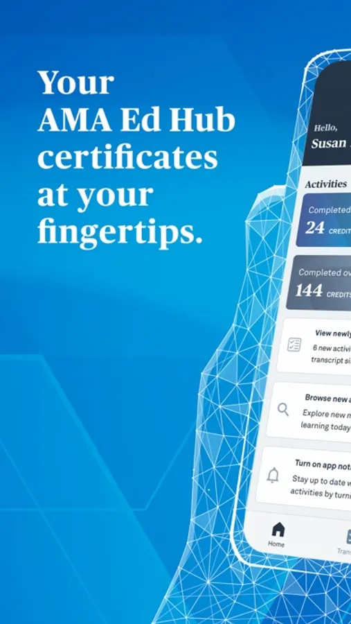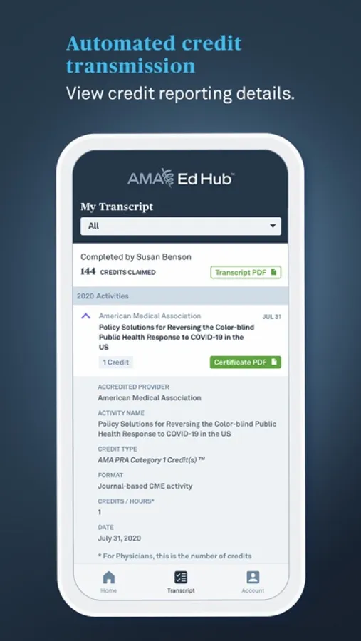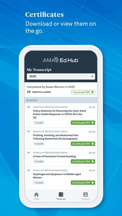 Now with the new, completely free, AMA Ed Hub Transcript app you can quickly access your AMA transcript, certificates and awards from the palm of your hand. No more manual spreadsheets or paper documentation, the AMA Ed Hub Transcript app will do the administrative work for you. This new app helps medical students, physicians and medical professionals easily manage their continuing education credit and transcripts.