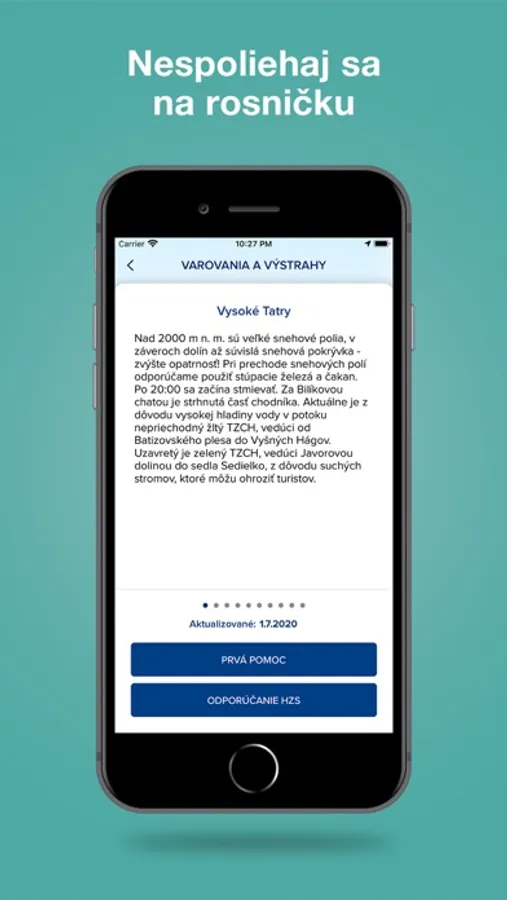 Nespoliehaj sa na to, že sa ti nič nestane, spoľahni sa radšej na aplikáciu, ktorá ti pre oblasti slovenských hôr zobrazí výstrahy pre daný deň, lavínové nebezpečenstvo i počasie a ty sa tak vrátiš v poriadku domov. Ak nie si profík, tak pre teba máme aj pravidlá pohybu na horách, horské záchranné „desatoro“, základy prvej pomoci, vrátanie interaktívneho návodu resuscitácie.