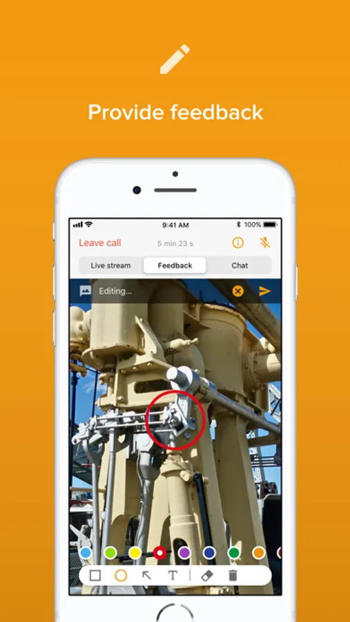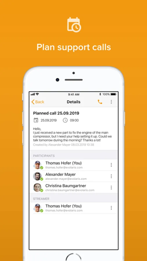 Live video and audio streaming allows specialists to guide the work process and send image-based feedback directly to the mobile device. This allows them to provide location-independent support in real time. Furthermore, the entire support call can be recorded and later used for training sessions. The communication is completely end-to-end encrypted.