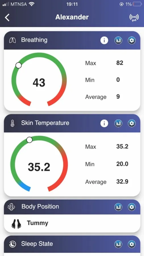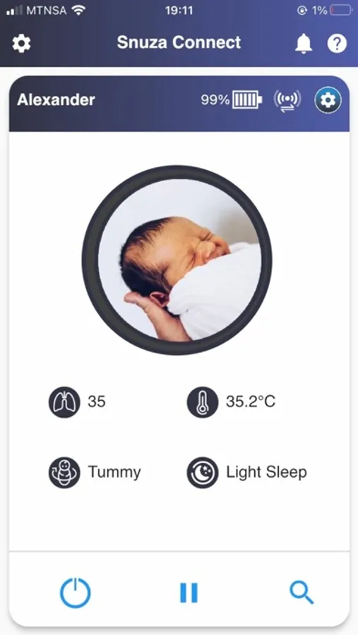 The Snuza Connect application connects to the Snuza Pico device via Bluetooth Low energy and allows for real-time monitoring of abdominal movement rate, skin temperature, body position and even fall detection if your baby takes a tumble! It allows users to set custom alarms and warnings for breathing rate temperature and position.