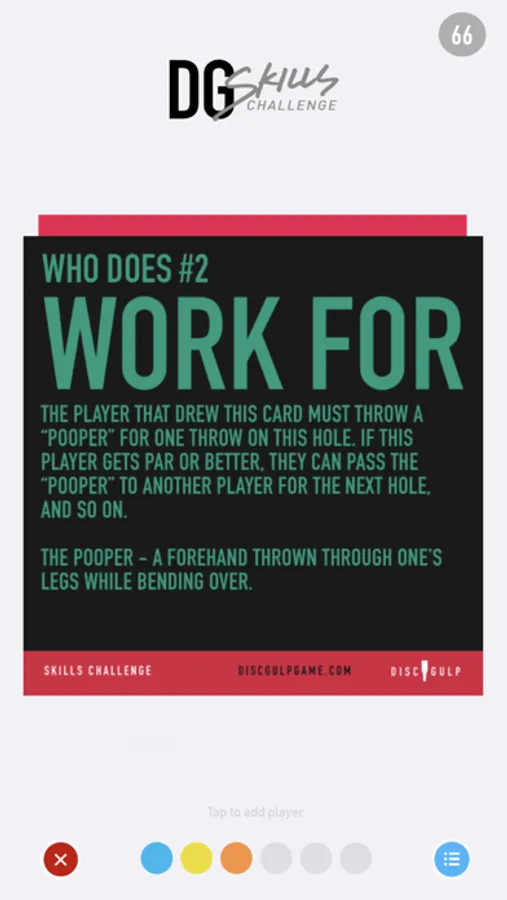 The DISC GULP skills challenge app is a completely unique app that enhances your Disc Golf experience. Over 70 cards effect your throw and your strategy as you find yourself in new and unexpected situations, no matter how many times you've hit the course.