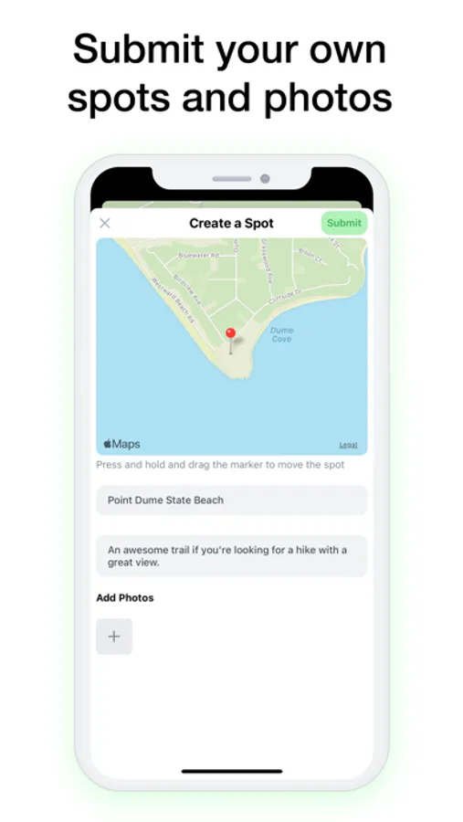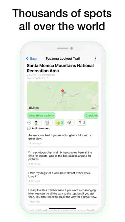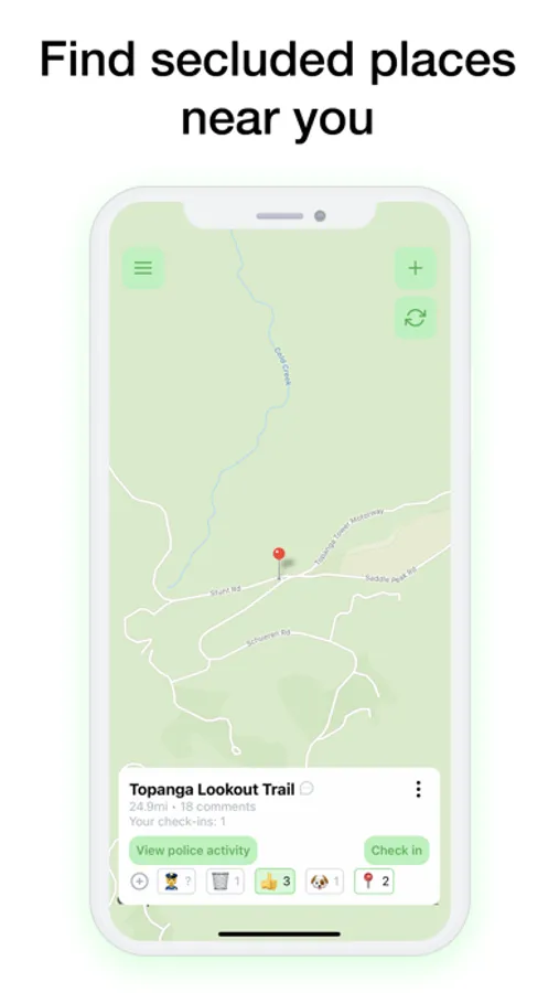 Find private, secluded places near you. You'll find spots with beautiful views, sunsets, photo ops, and more. Bring a date, have dinner, or just sit and relax. See pictures of the place ahead of time. Know if the spot is pet safe. Be informed about amenities like has trash cans, water fountains, and bathrooms before you get there. Even see if police are in the area. Submit your own spots and comment on others'.