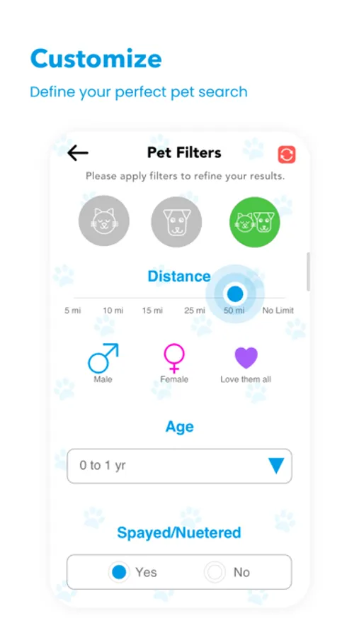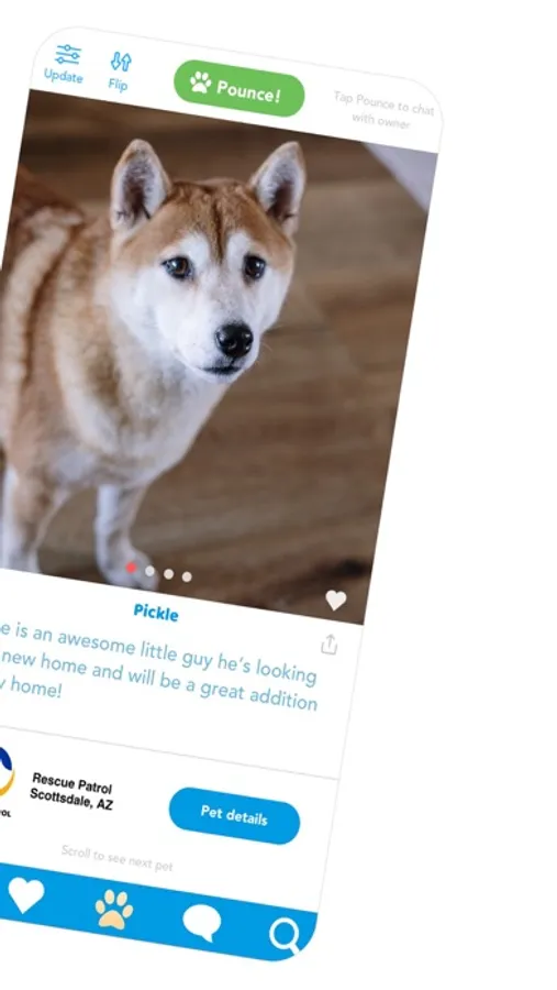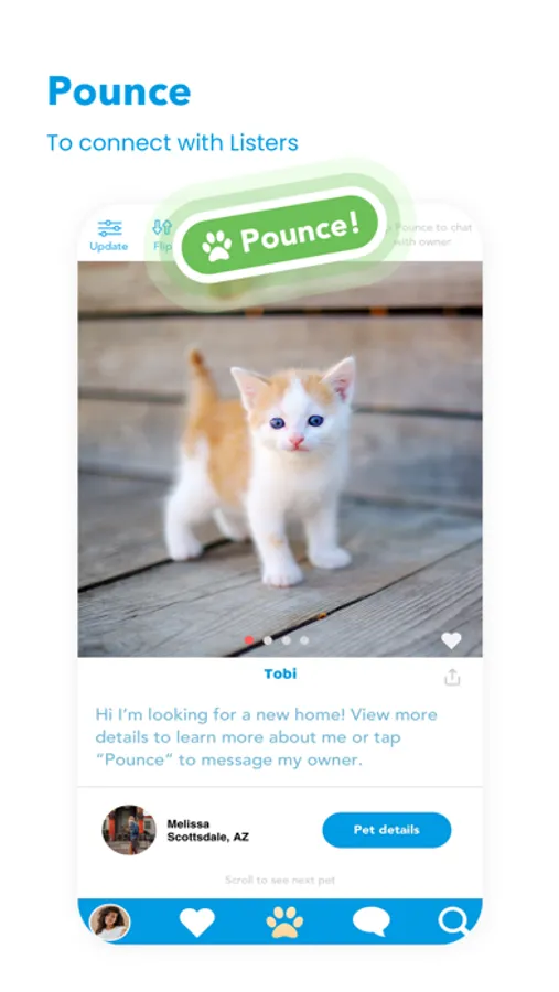 With the Pounce app you can match with adoptable pets based on the filters you set. So it’s easy to find the fur baby you’re looking for. Once you've found your match, simply hit Pounce! You’ll then be able to instantly connect and communicate with the parent, organization, rescue, and/or adoption center.
