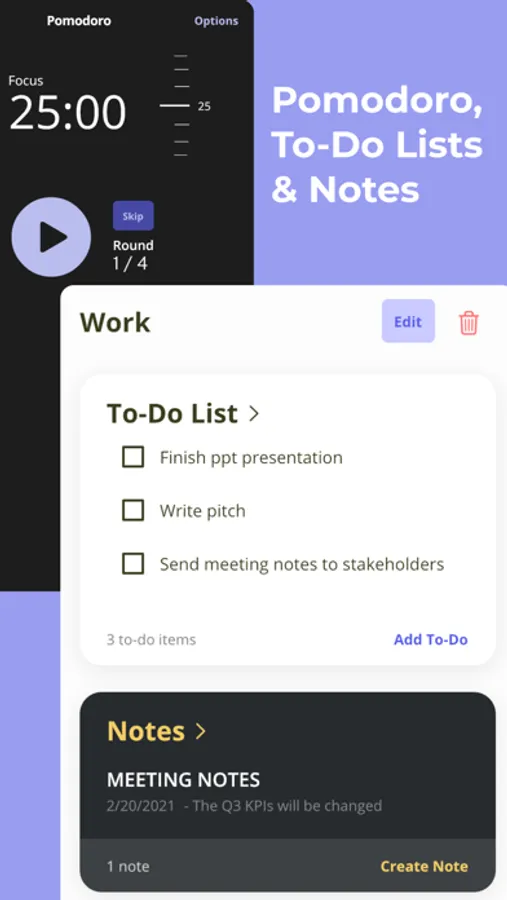 ◦ Focus timer: open the Pomodoro timer to apply the Pomodoro technique, set how long are the focus rounds, short breaks, and long breaks (the classic 25-10-30 technique or custom like 60 30 30)