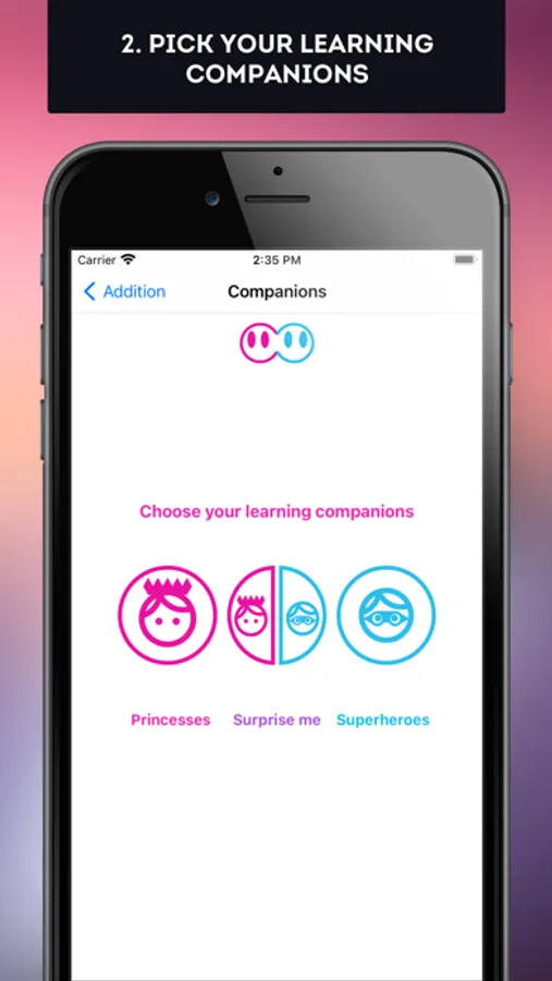 Superheroes or princesses will guide your child through basic math problems. The "challenge" screen has emojis for kids to select the characters they want. The "Surprise me" option serves up characters randomly.