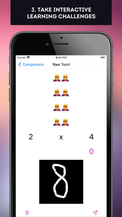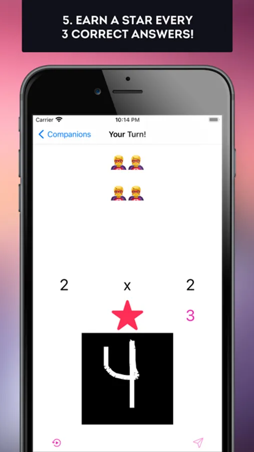 The app provides interactive math challenges. A mini blackboard requires to write out the answer. An AI engine recognizes the number, provides feedback, and rewards (a colorful star every 3 correct answers).