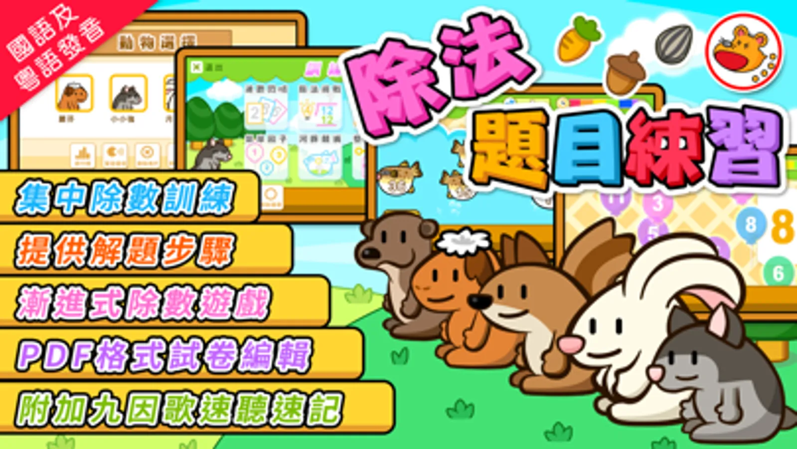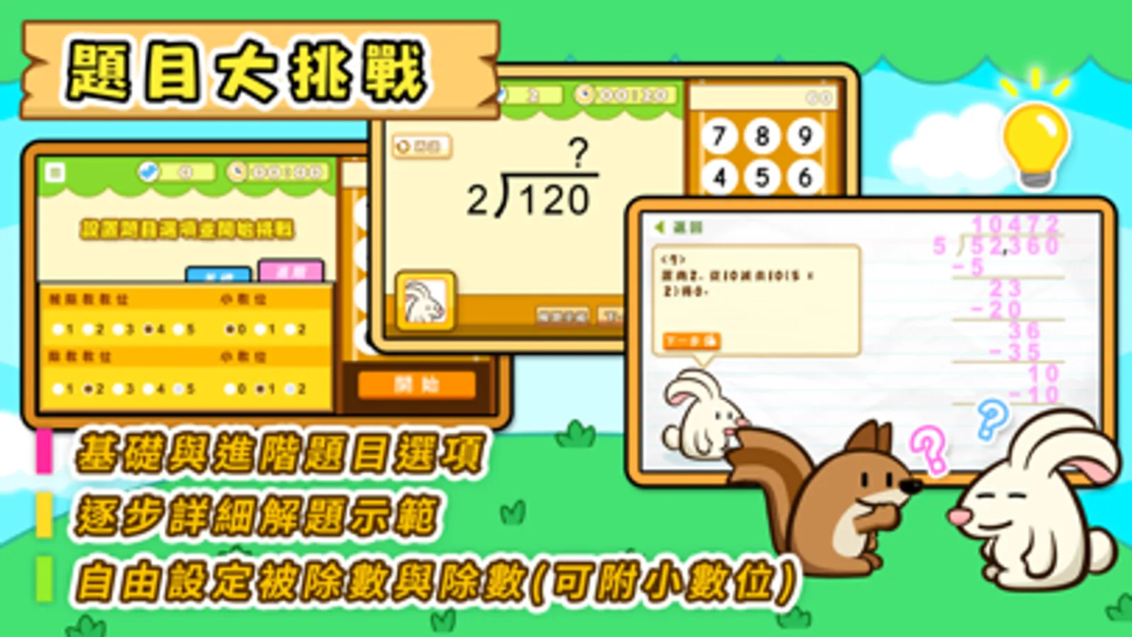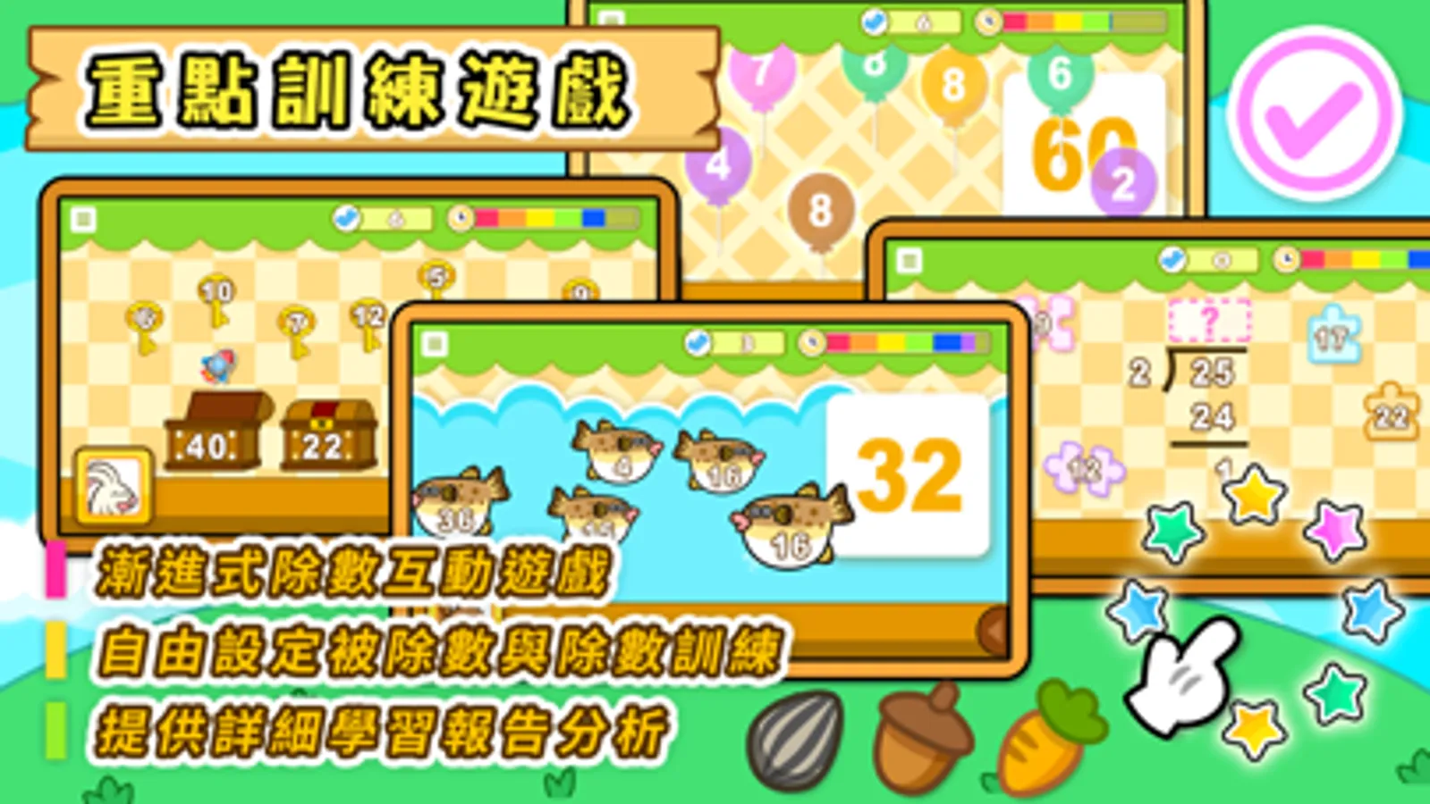 除法題目練習,是乘除數學訓練系列之一,通過有趣的重點訓練遊戲練習、多種除數題目設定訓練、以及解題示範器和試卷編輯器等,全方位強化兒童對除數的運算能力。