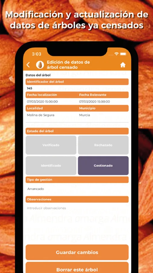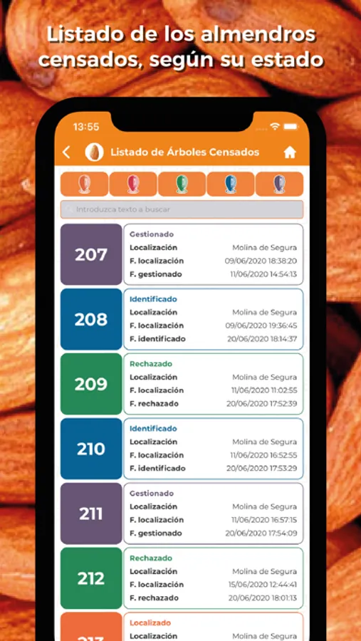 - Consulta de censo actualizado: consultar un listado de los almendros censados, poderlos filtrar según su estado (verificado, identificado a pie de campo, gestionado, etc), así como su ubicación geográfica en el mapa.