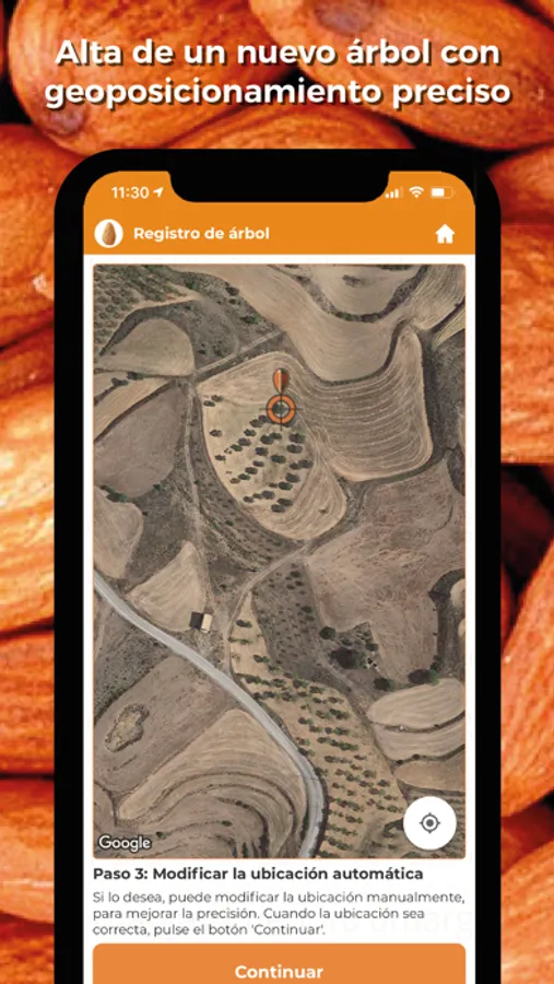 - Localizar un nuevo árbol: esta funcionalidad está pensada para, a pie de campo, dar de alta un nuevo almendro amargo. Esta herramienta utiliza varios puntos de triangulación GPS para maximizar la precisión de la ubicación de este árbol.