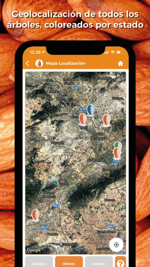 Esta aplicación hace uso de geolocalización para la detección de los árboles de almendro amargo en campo, a partir de capturas y localización mediante geoposicionamiento. El objetivo es que sus frutos no se recojan y que, en caso de que se haga, poder parar cuanto antes su entrada en el proceso industrial.
