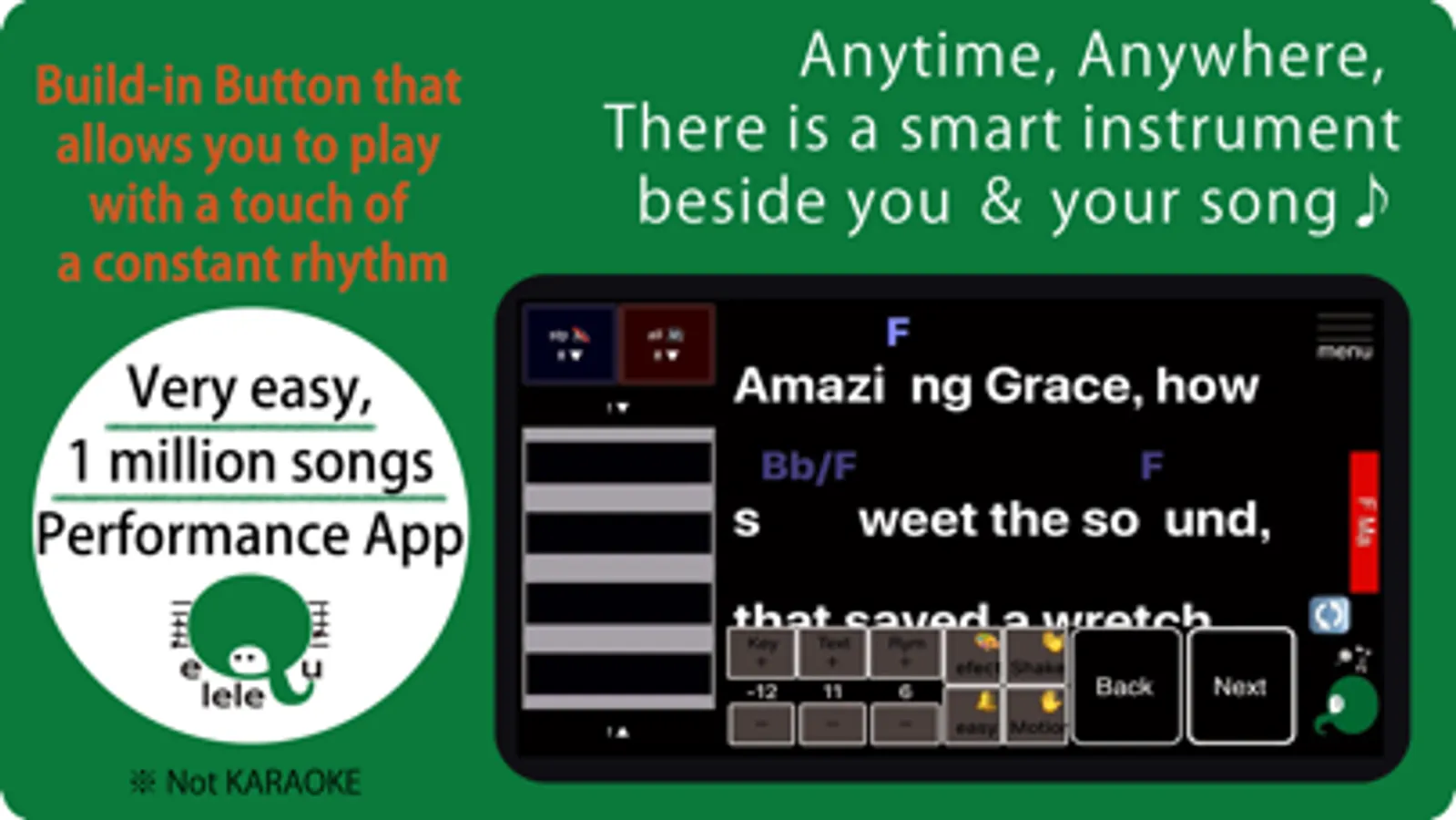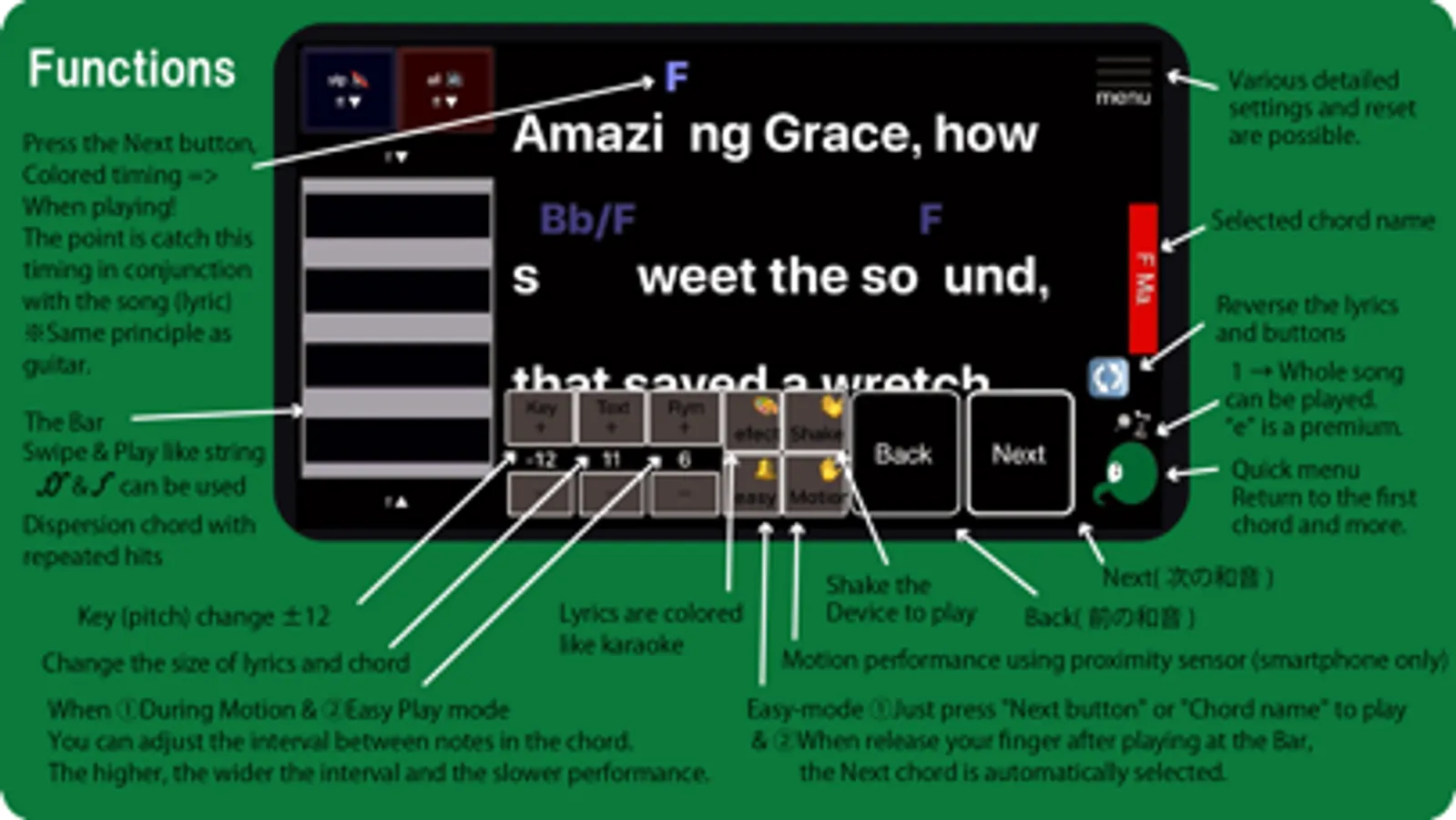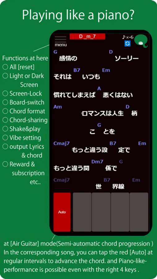 For compatible songs(more than 3000), semi-automation up to chord changes. You can play chords according to the music by playing at regular intervals (tap / swipe, or both). You can learn to play with your fingers, ears, and eyes (lyrics).