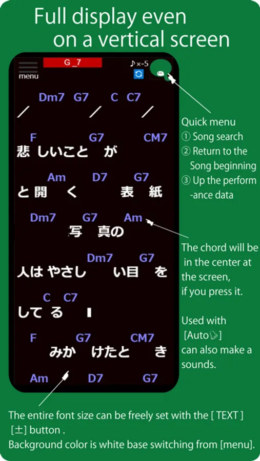 ◆ freely set the lyrics and chords of songs in the world, such as display, enlargement / reduction, and full screen display.