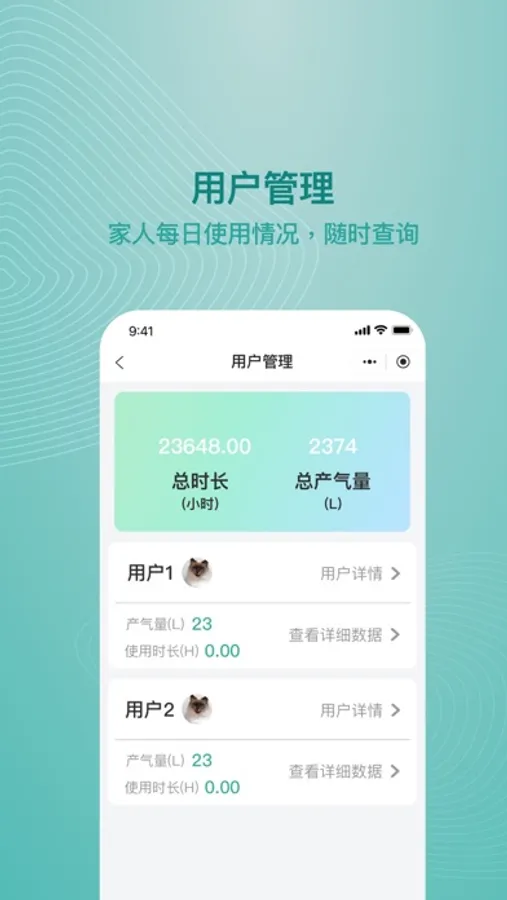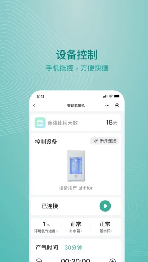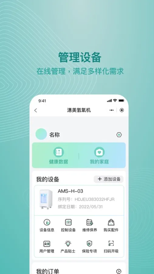 用户登录进入,绑定办公司氢氧机设备,就可以通过该app控制氢氧机设备的产气,也可以续租,提交维修保养订单,查看使用方法等。