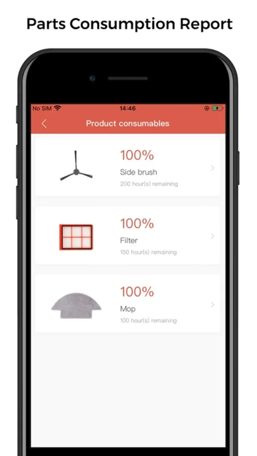5. Parts consumption report. Filters, mop pads and side brushes have to be replaced regularly. This APP smart reminder displays the usage of parts and will send reminder notifications to your smart phone when parts life is low and when it's time to replace.