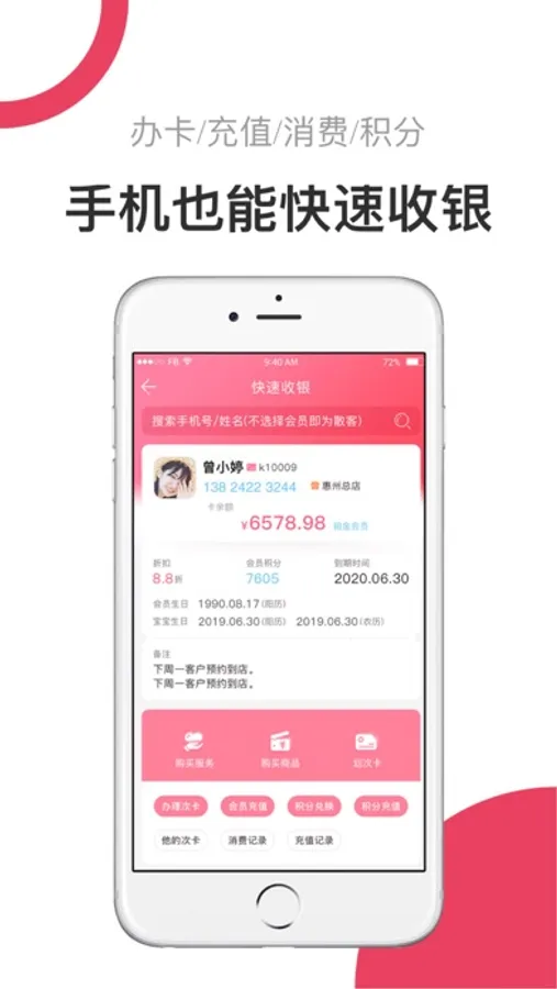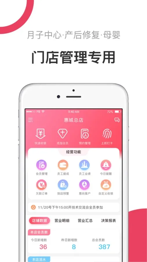 它拥有:会员管理、转介绍管理、次卡/套餐管理、收银结账、微信预约、微信推送消息、会员积分兑换、员工提成结算、库存管理、营业数据分析等......