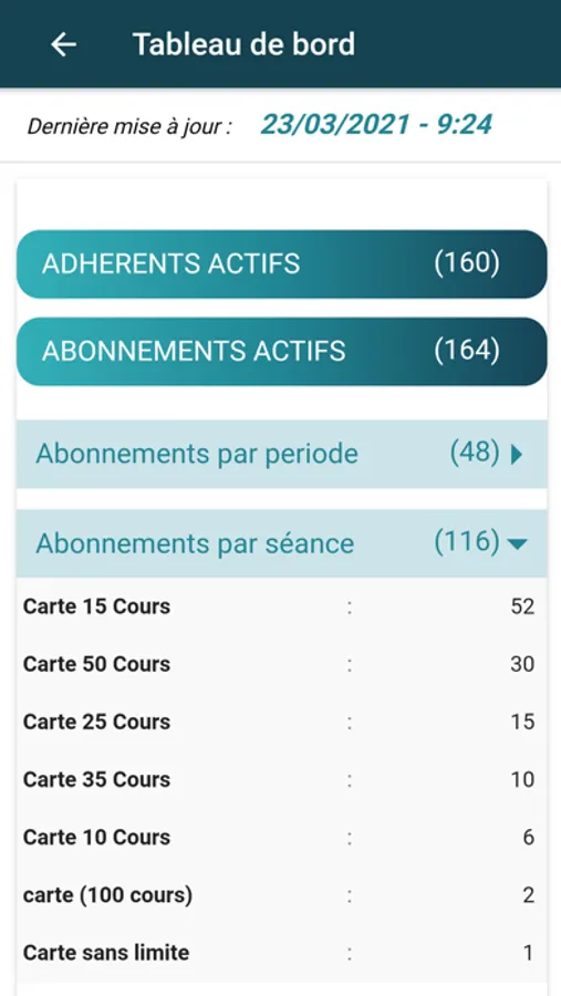 * Consulter le tableau de bord qui englobe les réservations encours les abonnements actifs et ses crédits actuels,