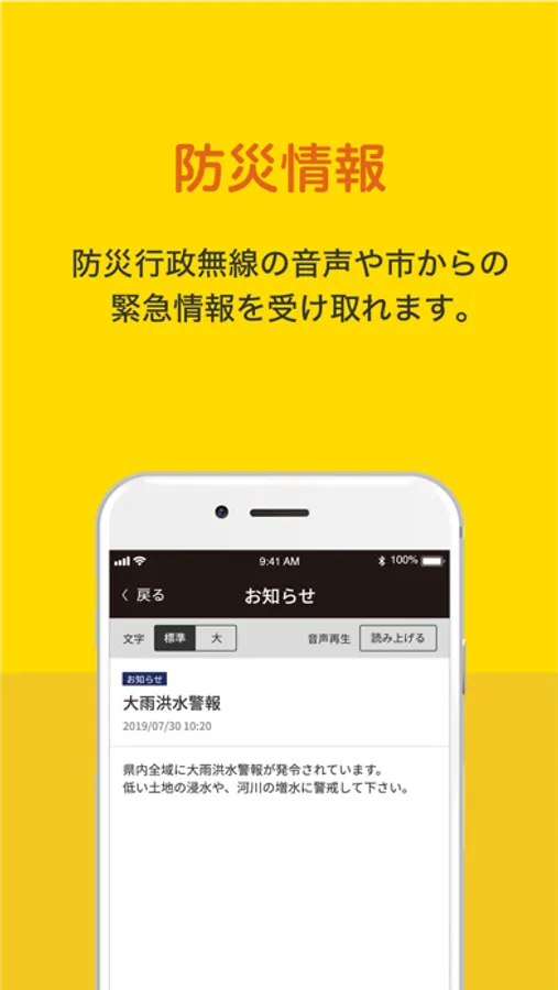防災行政無線の音声や市からの防災情報、気象警報や震度情報などを受け取ることができます。