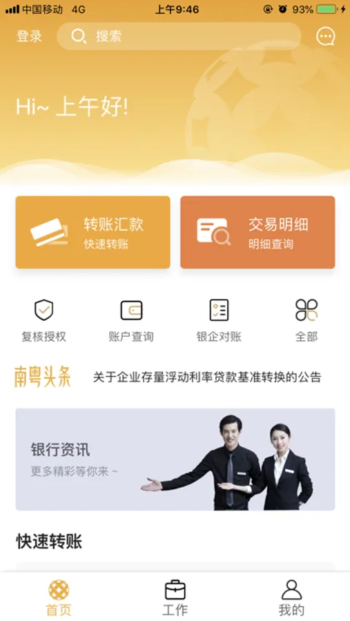 广东南粤银行企业手机银行采用金融主流的格调,具有简约、清亮的风格,为您提供智能贴心的服务。