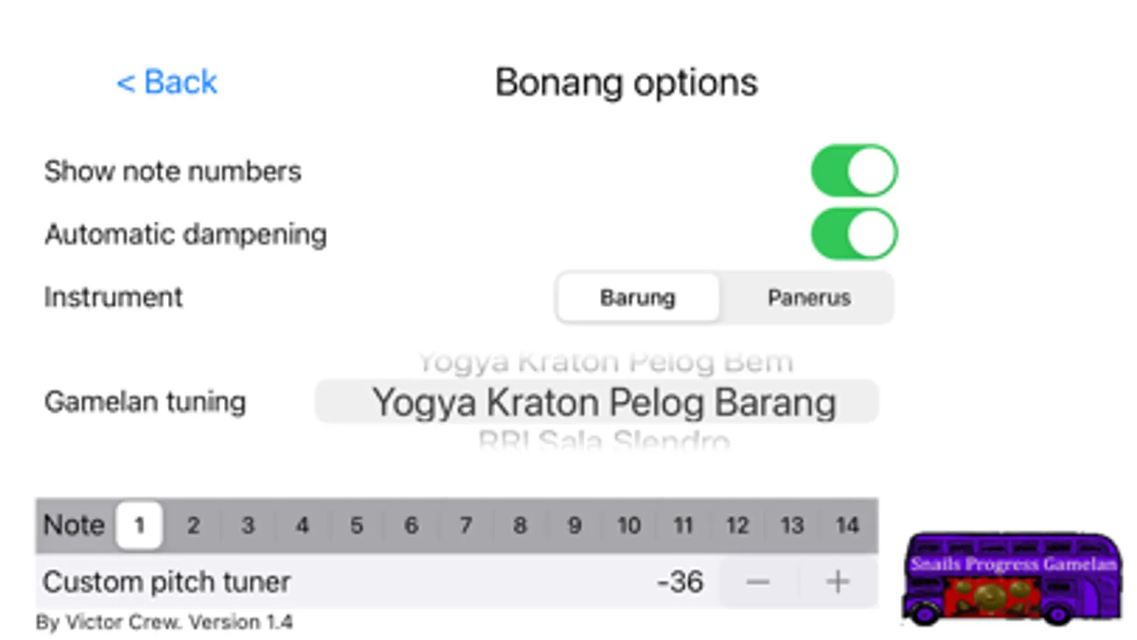 This is a basic simulator of the Bonang barung and panerus gamelan instrument. It is tuned in the slendro laras tuning system and uses sound samples from the Snail's Progress Gamelan which was made by great Javanese gong smith Pak Tentrem Sarwanto from Java.