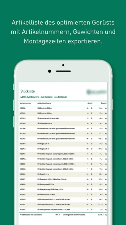 Nach Auswahl des passenden MJ-Gerüstsystems haben Sie über den integrierten Katalog Zugriff auf alle Bauteile. Auf dieser Materialbasis erhalten Sie die Artikeliste eines optimierten Gerüsts mit Artikelnummern, Gewichten und Montagezeiten.