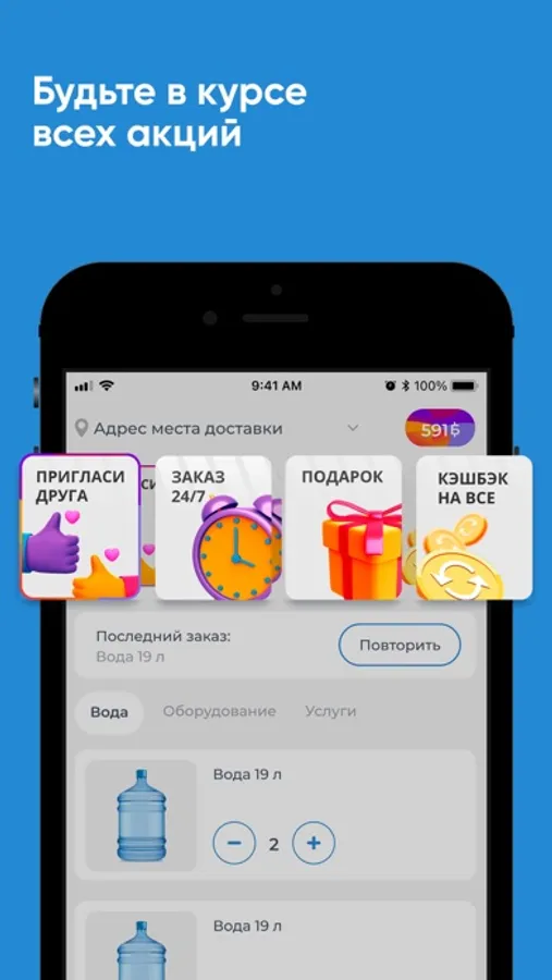 Скачайте бесплатное приложение на телефон и заказывайте чистую воду в удобное время!