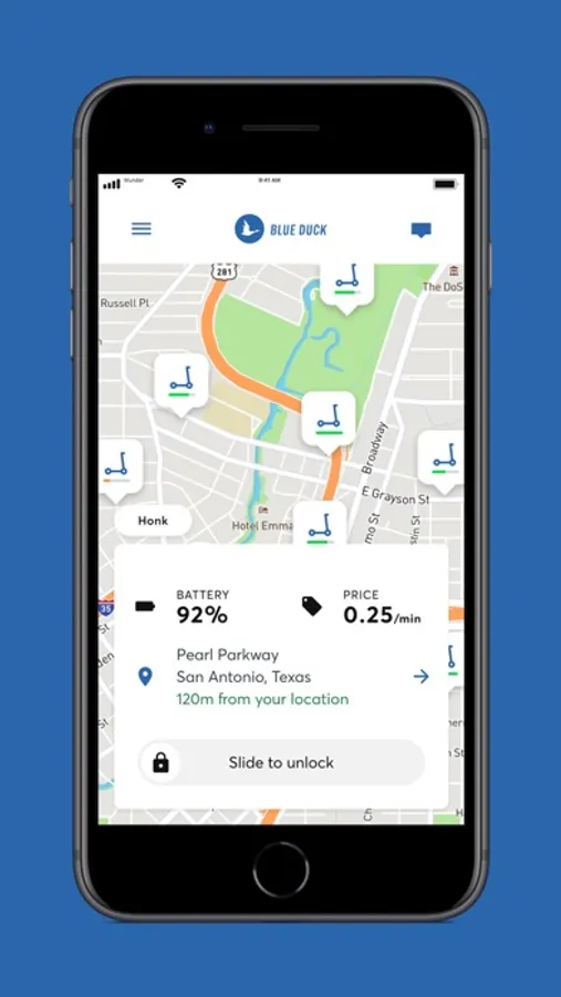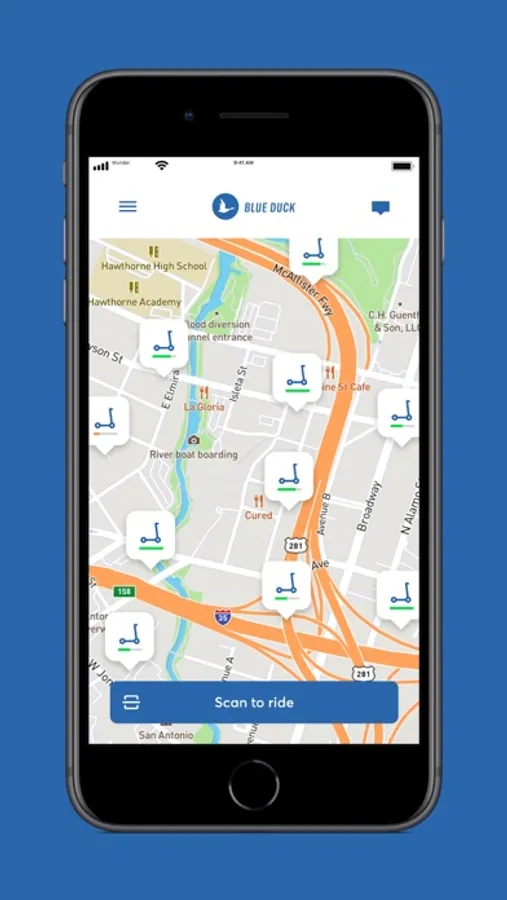 Blue Duck is giving users access to dockless personal electric vehicles at their convenience. Whether you're headed to work, out to lunch, or trying to get to class on time, Blue Duck is a fun, easy option to help you get where you're going! Powered by the Razor Micromobility Platform, Blue Duck is coming soon to urban spaces near and far. Check out flyblueduck.com to request a flock near you.