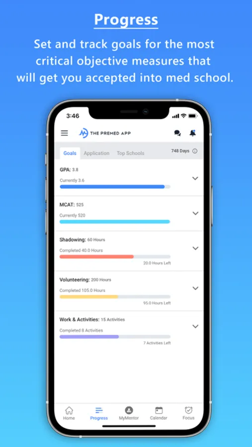 • Progress –Set and crush individual goals for GPA, MCAT score, shadowing, volunteering, extracurricular activities, required courses, letters of recommendation, etc.