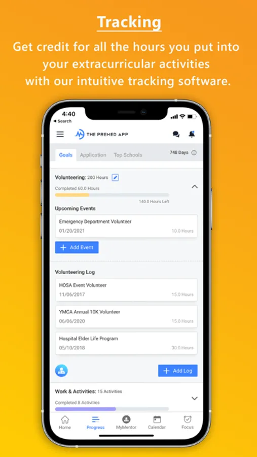 • Tracking – Keep track of all of your shadowing, volunteering, research, and other extracurricular activities with our intuitive tracking software.