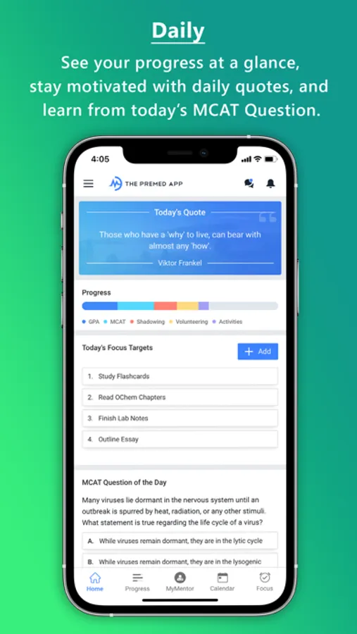 • Daily – Set your goals for the day, find motivation, learn something from the MCAT Question of the Day.
