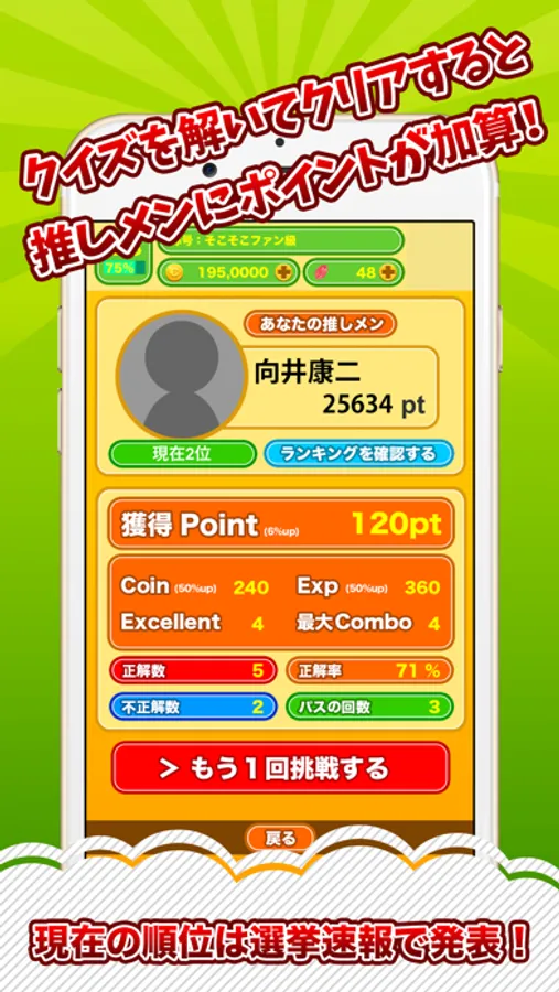 クイズを10問解くと推しメンにポイントが加算されます。(全問正解でポイント2倍!)