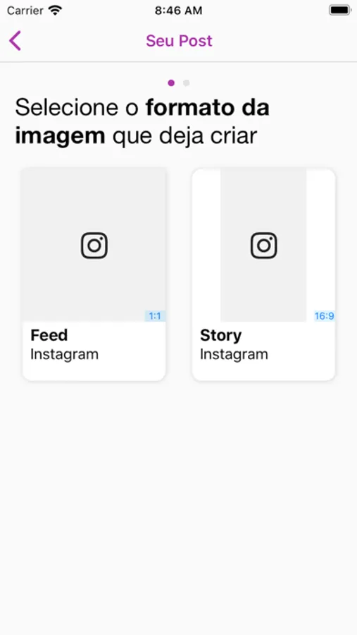 4.Caso queira criar o seu, selecione então o tipo de post: card para o feed ou Stories;