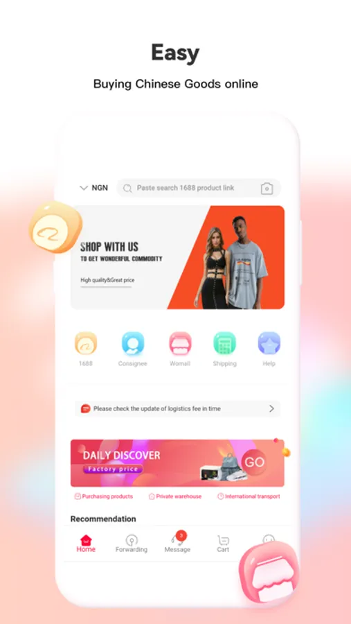 This is an APP for Nigerian people to purchase goods from China 1688 Mall and provide transshipment services