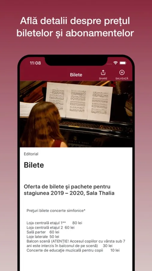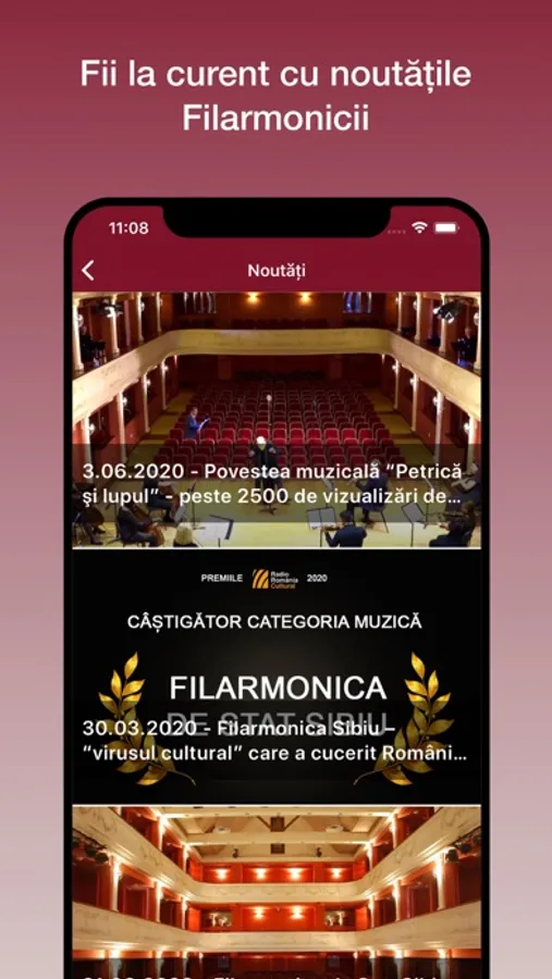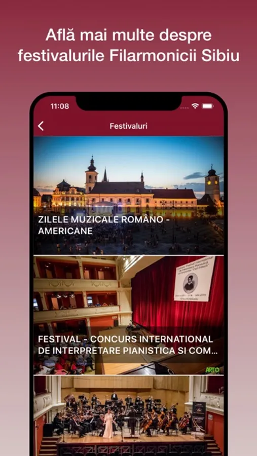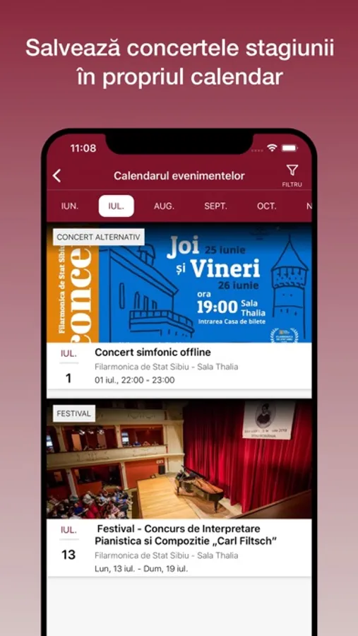Aplicația te ține la curent cu informații despre concertele stagiunii și evenimentele extraordinare ale Filarmonicii. Află detalii și salvează în calendar propriu și cele mai mari festivale de muzică clasică organizate la Sibiu precum Zilele Muzicale Româno-Americane, Festivalul- concurs de interpretare pianistică și compoziție „Carl Filtsch” sau Sibiu Opera Festival.