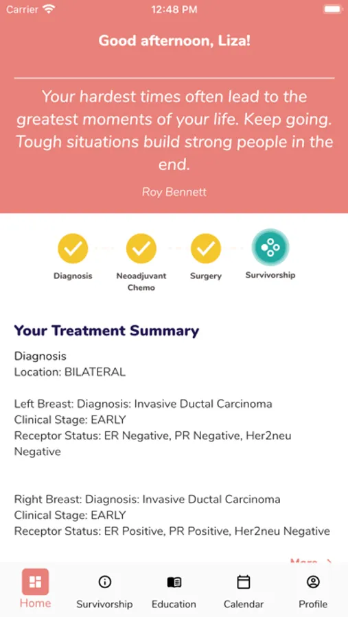 Designed by oncologists, the MyJourney app guides you through your cancer treatment. A self-management tool, that keeps you connected virtually to your oncology team. MyJourney empowers breast cancer patients and survivors by providing ease of access to personalized treatment and community resources.
