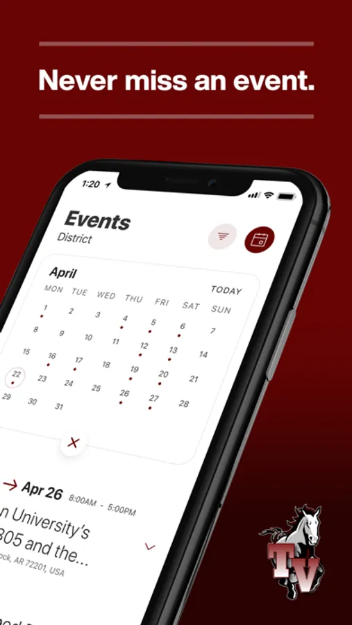 The event section shows a list of events throughout the district. Users can add an event to your calendar to share the event with friends and family with one tap.