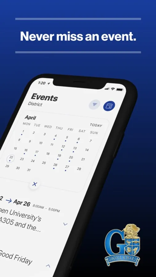 The event section shows a list of events throughout the district. Users can add an event to your calendar to share the event with friends and family with one tap.