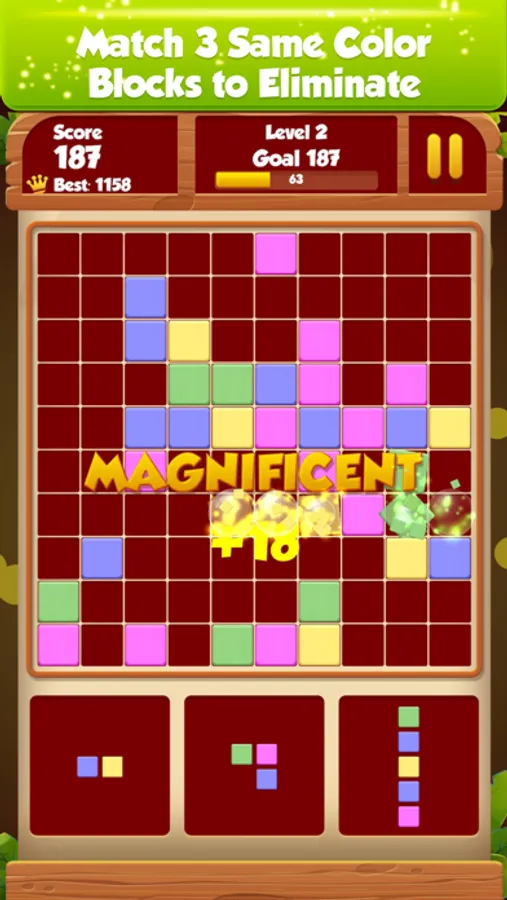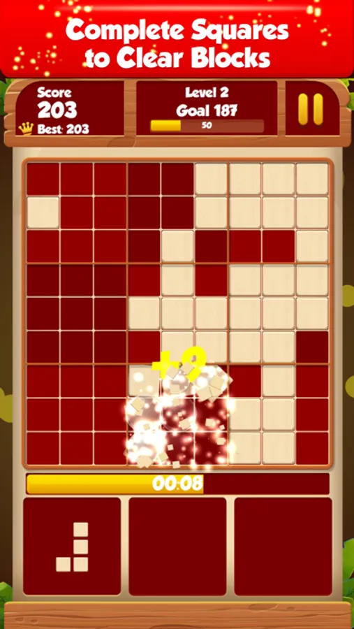 Challenge against time. Use all shapes in limited time and fill the row or column or 3x3 square grid to clear blocks.