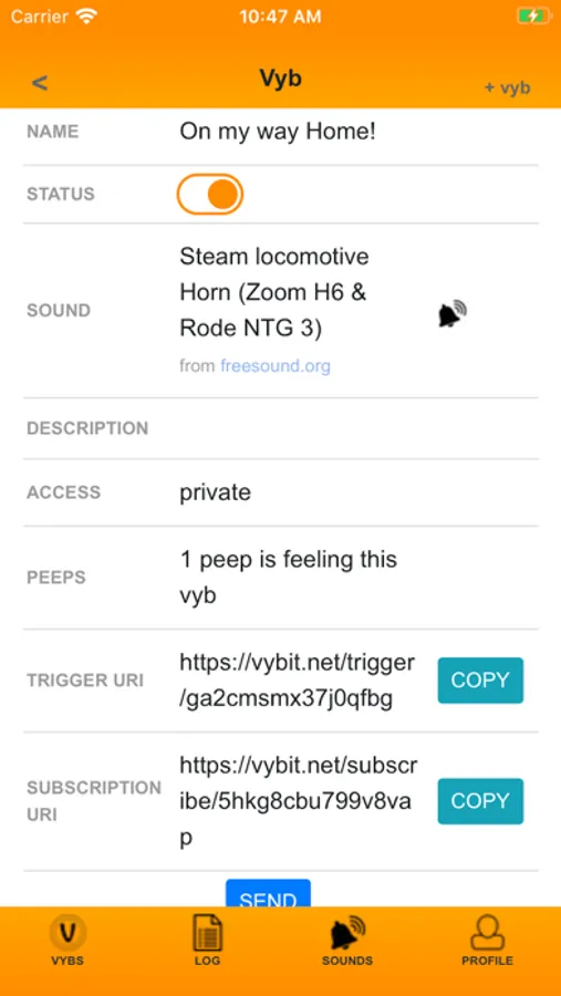 Vybit is awesome because you can be alerted to things happening that are important to you by sounds that YOU CREATE or CHOOSE! Sure, our devices make generic sounds to notify us of things, but then we have to look down and visually process the message to get the details. With Vybit you will know exactly what the sound means because YOU CREATE OR CHOOSE THE SOUND! Humans can recognize thousands of distinct sounds. The purpose of Vybit is to take advantage of this capability. Each individual sound, i.e., VIBE, that you choose is connected to a specific event, or BIT, of information, ergo, Vybit! :)