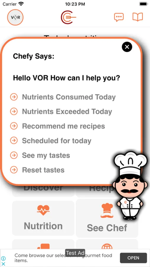* Ask the chef to show you the amount of nutrients consumed or exceeded today. You can also ask him for food recommendations to complete or level the missing or exceeded nutrients, respectively ("Chef" section).