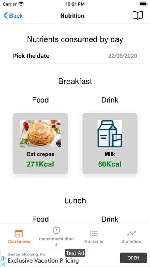 * Record your food intake for breakfast, lunch, dinner, snack, desserts and drinks, so you can review what you have consumed each day and view statistics of your progress ("Nutrition" section).
