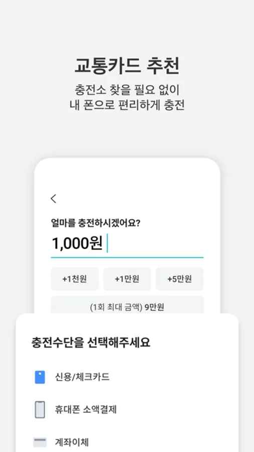- 신용/체크카드, 계좌이체, 휴대폰소액결제를 이용하여 편리하게 충전할 수 있어요.