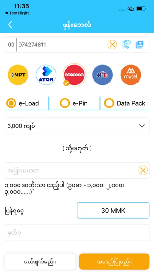 (1) Mobile Topup (MPT, Telenor, MyTel, Ooredoo, MECTel)