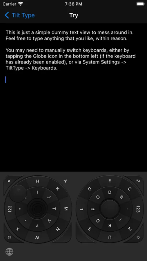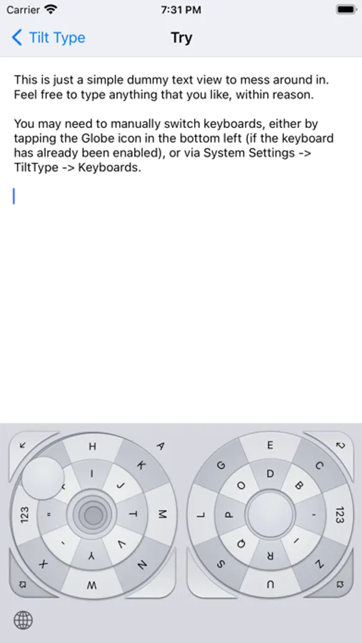 The TiltType Keyboard is an experiment in touch-based text input and UX design. It wasn't intended to replace our day-to-day keyboards, as it is not much more than a polished proof-of-concept, but I do think it shows real promise. It's something that was fun to build, is still fun to play with, and which I hope can in some ways contribute to or influence other such experiments in the future. Enjoy!