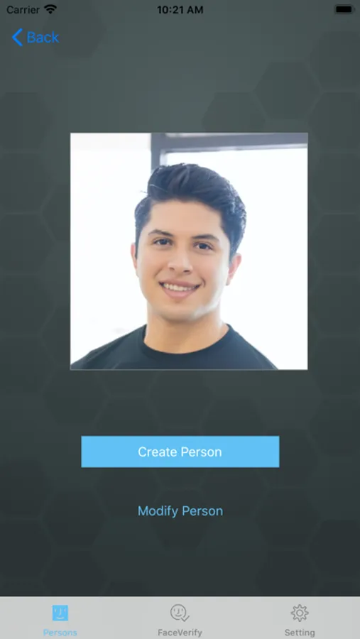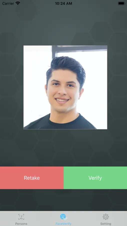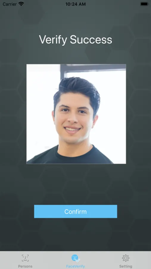 airaFace APP 提供 臉部驗證功能,使用者可以先拍照後,透過人臉辨識伺服器進行1:N臉部驗證,驗證成功就會顯示 姓名和員工編號。